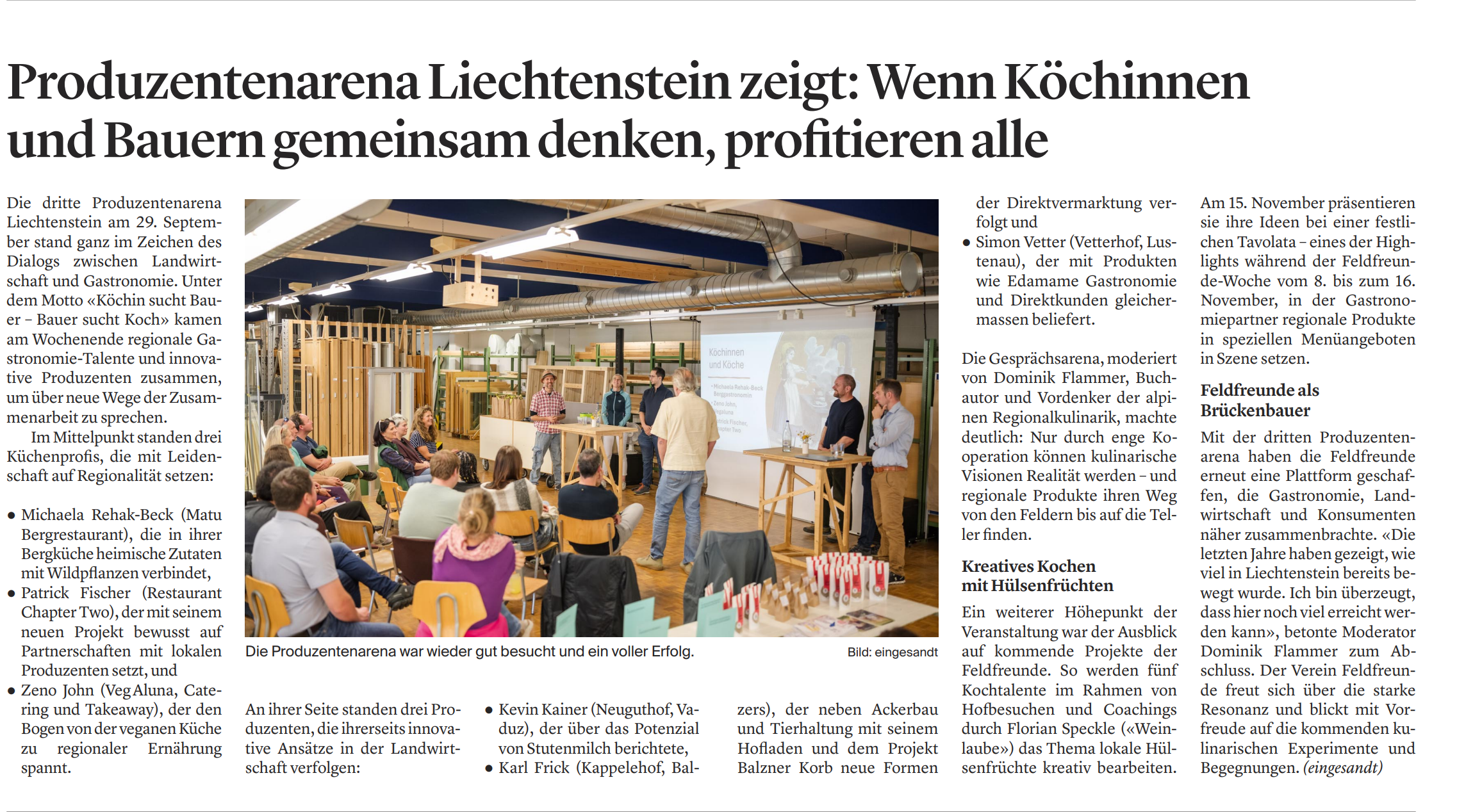 Innovative Produzent:innen und regionale Gastronomietalente im Dialog, dieses Format fand am letzten Septembermontag zum dritten Mal in Liechtenstein statt, im Zentrum für zirkuläres Bauen ZirkuLIE in Triesen. Auf der einen Seite waren das drei Küchenprofis (Michaela Rehak-Beck vom Matu Bergrestaurant, Patrick Fischer vom Restaurant Chapter Two und Zeno John von vegAluna), auf der anderen Seite drei Produzenten (Kevin Kainer vom Neuguthof in Vaduz, Karl Frick vom Kappelehof in Balzers und Simon Vetter vom Vetterhof in Lustenau). Moderiert wurde die Arena von Dominik Flammer, Regionalkulinarikprofi und Buchautor. Das Format schafft Verbindungen, um Produkte auf möglichst kurzem Weg vom Feld auf den Teller zu begleiten.