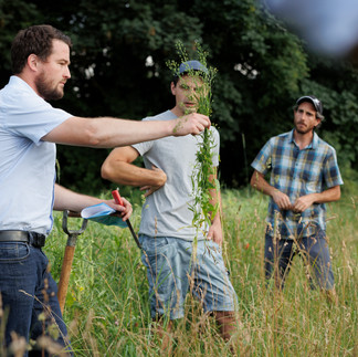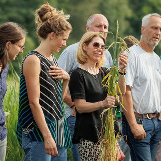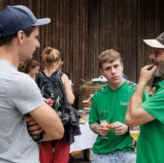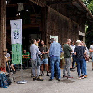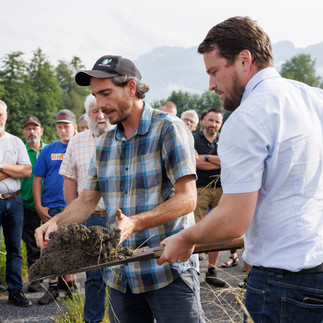 Auf dem Hof von Samuel Schierscher trafen sich interessierte Leute um Neues über den Anbau von Getreiden und Hülsenfrüchten für die menschliche Ernährung in Liechtenstein zu erfahren. Nachdem Samuel seinen Demeter-Hof vorgestellt hat, geht es zuerst zum Dinkelfeld. Eine Spatenproben zeigt die lockere Struktur des Bodens, der von guter Qualität ist. Weiter geht es zu einem Feld mit Speiseerbsen. Aus den Schoten entfernt schmecken die Erbsen auch frisch vom Feld schon erstaunlich gut. Einen Spaziergang weiter wachsen Kichererbsen, diese wurden relativ spät ausgesät und müssen vor Unkrautbewuchs geschützt werden. Dies geschieht mechanisch mit Hilfe eines Hackgeräts, dass Samuel zur Veranschaulichung auf dem Feld stehen gelassen hat. Nach einem Blick in den offenen Laufstall ist ein Apéro bereit und es wird rege ausgetauscht und diskutiert. Das Brot am Apéro wurde übrigens aus Dinkelmehl von Samuel von der hpz für uns gebacken und war fantastisch! Herzlichen Dank an alle für diese tolle und informative Veranstaltung!